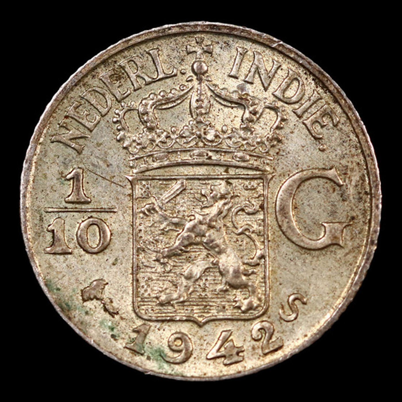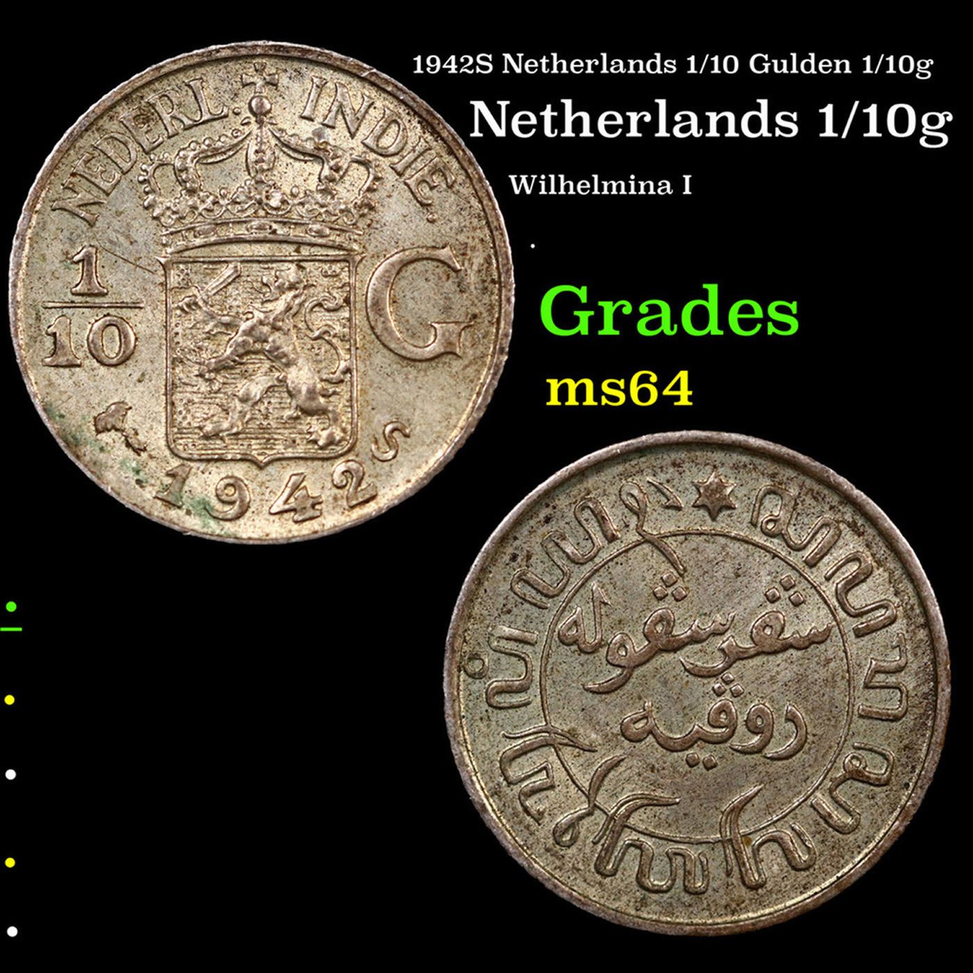 1942S Netherlands 1/10 Gulden 1/10g Grades Choice Unc. Wilhelmina (Wilhelmina Helena Pauline Maria; 31 August 1880 – 28 November 1962) was Queen of the Netherlands from 1890 until her abdication in 1948. She reigned for nearly 58 years, longer than any other Dutch monarch. Her reign saw both World War I and World War II, as well as the Dutch economic crisis of 1933.The only child of King William III of the Netherlands and Emma of Waldeck and Pyrmont, Wilhelmina ascended to the throne at the age of 10 after her father's death in 1890, under her mother's regency. After taking charge of government, Wilhelmina became generally popular for maintaining Dutch neutrality during the First World War and solving many of her country's industrial problems. By that time, her business ventures had made her the world's first female billionaire in dollars. She went on to ensure that her family was one of seven European royal houses remaining in existence.Following the German invasion of the Netherlands in 1940, Wilhelmina fled to Britain and took charge of the Dutch government-in-exile. She frequently spoke to the nation over radio and came to be regarded as a symbol of the resistance. By 1948, she had returned to the liberated Netherlands and was the only survivor of the 16 monarchs who were sitting on their thrones at the time of her coronation. Increasingly beset by poor health, Wilhelmina abdicated in favour of her daughter Juliana in September 1948 and retired to Het Loo Palace, where she died in 1962.She remains popular in the Netherlands, even among the Dutch Republican movement. This is due to her being seen as a symbol of Dutch Resistance during World War II.