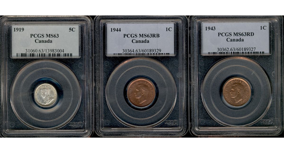 1943 1¢, 1944 MS63 & 1919 5¢ MS63. Lot of 3 PCGS graded coins. 1944 designated RB.