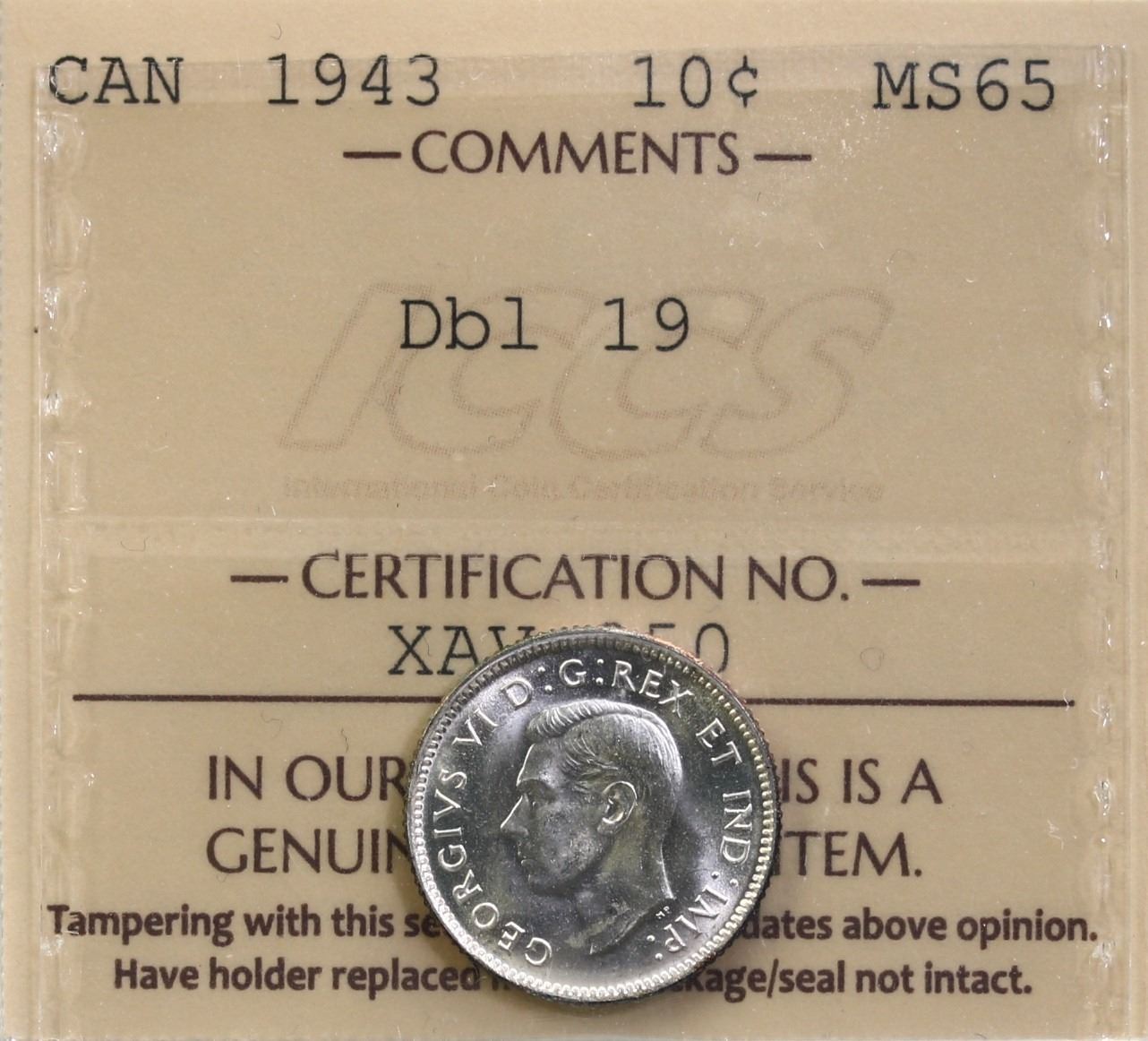 1943 10¢ "Dbl 19" ICCS Gem Mint State-65. A superbly lustrous example of an unlisted variety, an excellent example of this variety which is not shown in trends. A 1938 "Dbl 193" in Choice Mint State-64 brought it $896 at the 2025 Summer Sale.