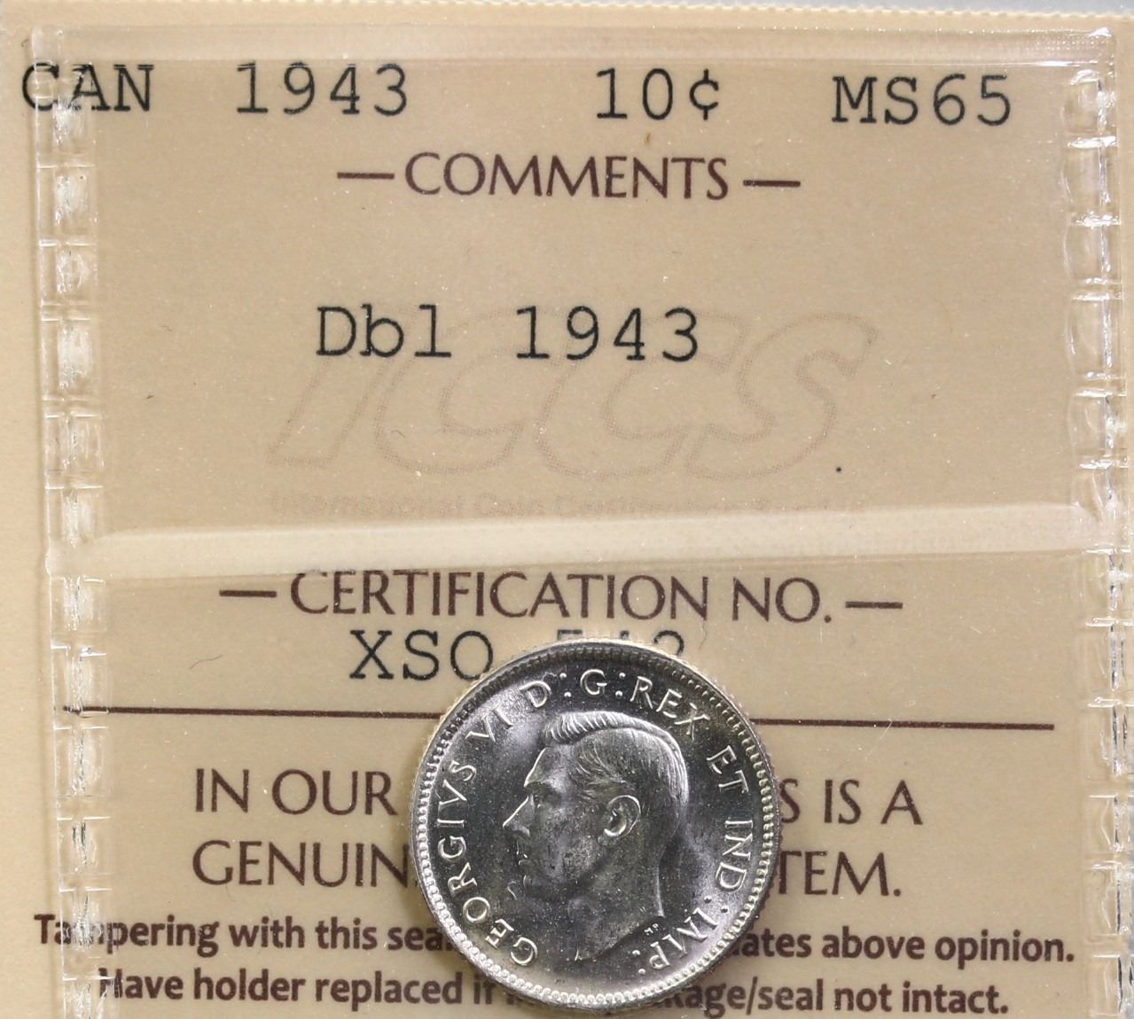 1943 10¢ "Dbl 1943" ICCS Gem Mint State-65. A truly impressive example with a fully doubled date, unlisted in trends. Amazing luster enhances this already desirable gem, surely one of the only examples graded with a fully doubled date and likely the finest among the few. A very exiting coin for collectors of this series and their varieties, don't let this one get away! A 1938 "Dbl 193" in Choice Mint State-64 brought it $896 at the 2025 Summer Sale.