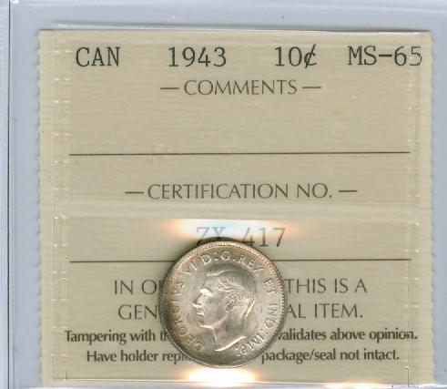 1943 10¢ ICCS MS65. Light toning over full underlying luster. Excellent strike with clean fields and lovely surfaces.