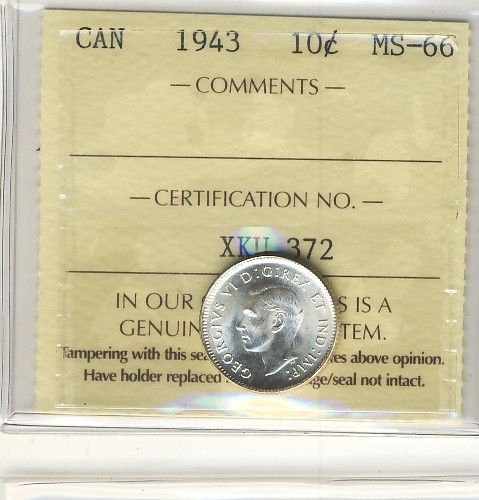 1943 10¢ ICCS MS66. Sparkling full white coin.