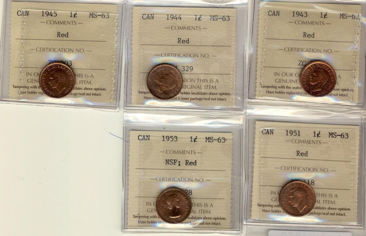 1943, 1944, 1945, 1951, 1953 NSF. Lot of 5 ICCS graded 1¢ c
