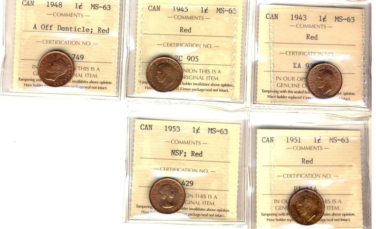 1943, 1945, 1948 A off, 1951, 1953 NSF. Lot of 5 ICCS graded 1¢ coins, all MS63 Red.