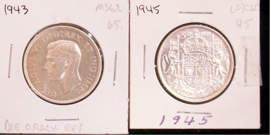 1943 & 1945 50¢. Lot of 2 coins both MS60 or better.