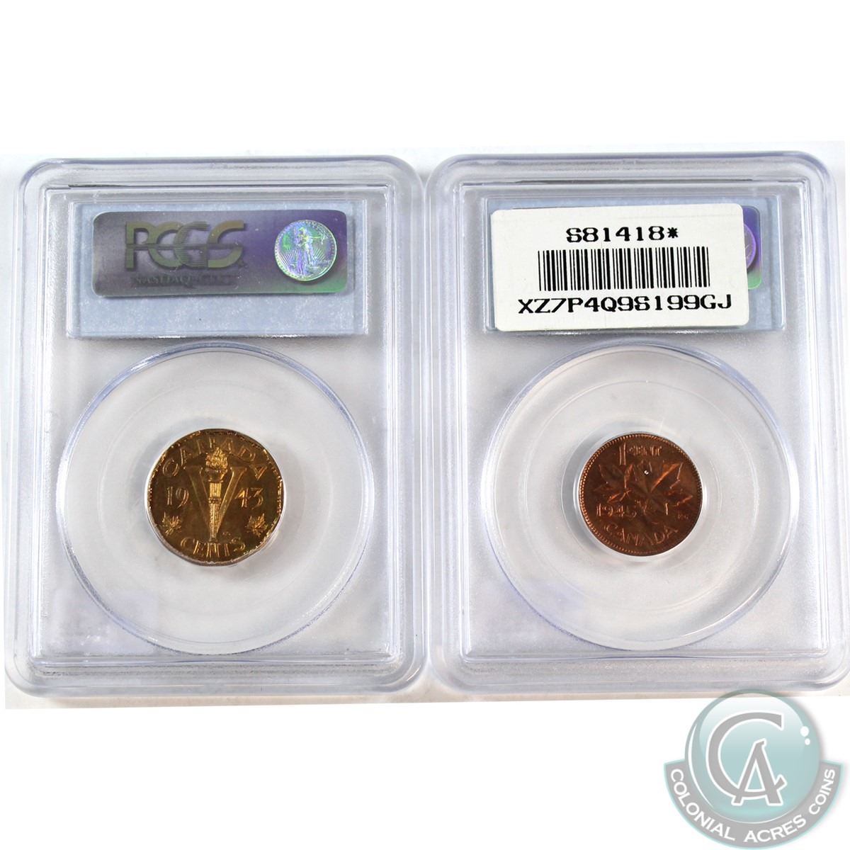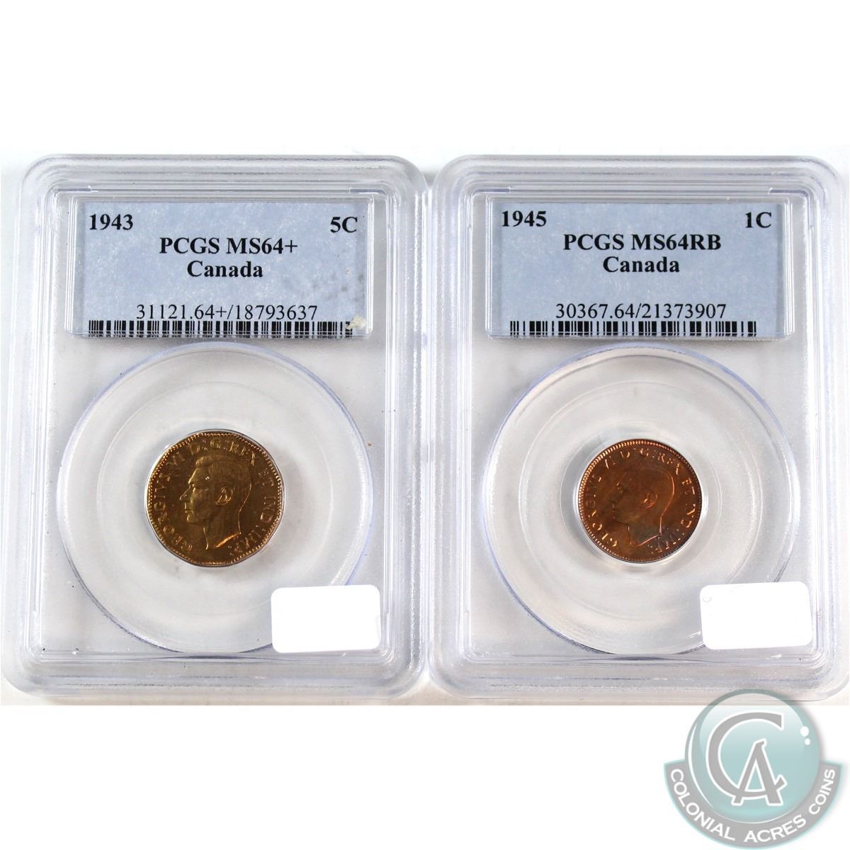1943 & 1945 Canada 1-cent PCGS Certified MS-64. 1945 is Red/Brown. 2pcs