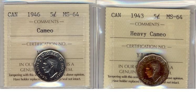 1943 & 1946 5¢. Lot of 2 coins both ICCS MS64 with the Tombac designated as Heavy Cameo.