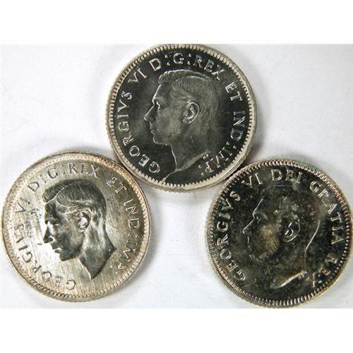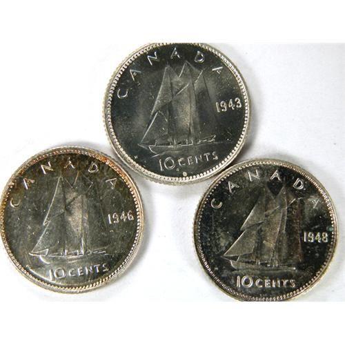 Canada Ten Cents 1943, 1946 and 1948, all Choice Uncirculated and all pale toned