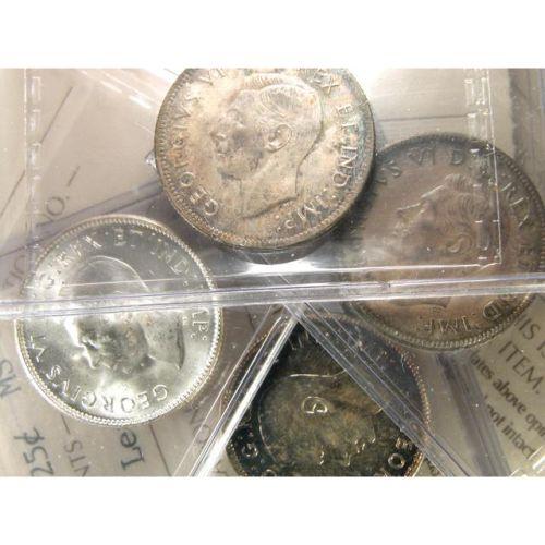 1943 and 1947 Maple Leaf two pieces, these three pieces all ICCS MS-64, one of the 1947s with a Rim Nick. Plus 1944 ICCS AU-50. Total four pale toned to light-medium toned pieces