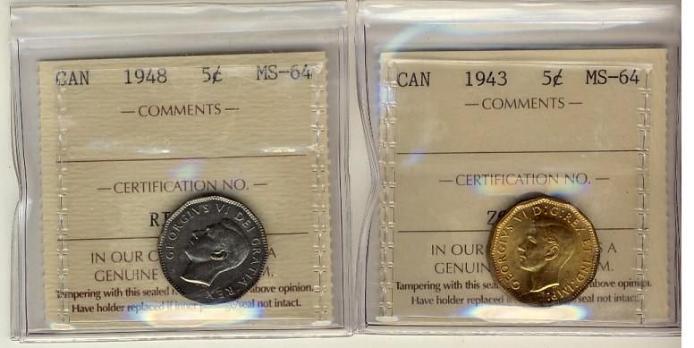 1943 & 1948 5¢ ICCS MS64. Lot of 2 coins.