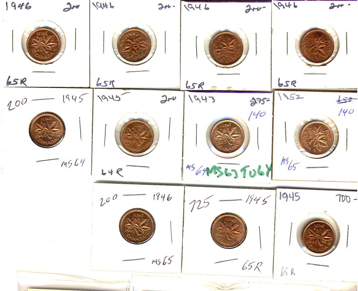 1943-1952 1¢. Lot of 11 coins all BU63 to BU64 red. Includes 1943, 1945 (4), 1946 (5) and 1952. Should be viewed.