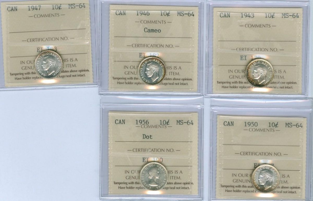 1943 - 1956 10¢. Lot of five coins all ICCS MS64. Includes 1943, 1946 Cameo, 1947, 1950 and 1956 dot.