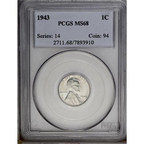 <B>1943<1C> MS68 PCGS.</B></I> The surfaces are nearly flawless and show no traces of oxidation or spotting. Simply unimprovable quality and great eye appeal. Population: 47 in 68, 0 finer (3/06).<BR><I>From The Kendall Marie #4 All-Time Finest PCGS Registry of Lincoln Cents with Varieties, Circulation Strikes, 1909-1958.</B></I> <BR><BR><B>Important notice:</B> Heritage usually auctions material at the rate of 200-250 lots per hour. On some occasions eBay Live bid software or the Internet may not be able to keep up with the pace of the auction. We recommend placing a realistic absentee bid now as insurance to avoid disappointment. Occasionally the auctioneer may eliminate or reject an eBay Live bid, and the auctioneer may also reopen a lot after the close of the eBay live bidding (usually because we missed an audience bid), and may reject your bid even if it shows you as the winning bidder. By bidding via eBay Live, you agree that Heritage may award the lot to another bidder at its sole discretion under the circumstances described above or any other reasonable circumstances. Since eBay bids are not shown to us until we open the lot on the floor, we treat those bids just like floor bids. In most cases the floor responds before the eBay bid is presented to us, due to Internet lag time, so for consistency we have made it a policy that floor bids are always considered first over tie eBay live bids. Also please note that all Heritage lots purchased through eBay Live carry a 20% Buyer's Premium. Please make sure you read the Terms and Conditions before you bid. This lot is being auctioned in conjunction with a live floor auction by Heritage Galleries & Auctioneers. All final auction and invoice information will be supplied by Heritage Galleries & Auctioneers, and all other information should be considered preliminary. Lot:557 <BR><BR><B>Winning Notification and Billing:</B> After the FINAL session in this auction is complete, Heritage will send e-mail and snail mail invoices. This process normally takes several days. All final auction and invoice information will be supplied by Heritage Galleries & Auctioneers, and all other information should be considered preliminary. <BR><BR>This auction will be conducted on a live auction floor and over the Internet through eBay Live. If you choose to place an absentee bid, please take a moment to <font color='#0000ff'><u><a href='http://pages.ebay.com/liveauctions/help/before/laabsentee.html'>learn how eBay Live absentee bidding works</a></u></font><font color='#000000'>