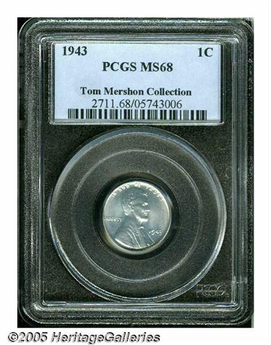 <B>1943<1C> MS68 PCGS.</B></I> With fully brilliant luster and flash, this specimen stands in elite company atop those previously graded by PCGS. Population: 48 in 68, 0 finer (3/05).<BR><I>From The Tom Mershon #2 All-Time PCGS Registry Set of Lincoln Wheat Cents.</B></I>