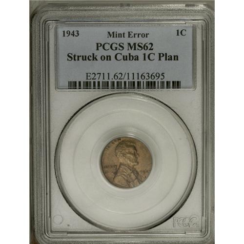 <B>1943<1C> Lincoln Cent--Struck on a Cuba 1 Centavo Planchet--MS62 PCGS.</B></I> Few among us can afford to purchase a Mint State 1943 copper cent, no matter that it would be the highlight of even an advanced collection of Lincoln cents. But off-metal alternatives are available, such as a 1943 cent struck on a silver dime planchet. Even scarcer and more exotic wrong planchet errors are possible. The United States struck coins for nine foreign countries in 1943, partly because World War Two made it difficult for countries like Australia and Fiji to receive coinage from their usual sources. The present 1943 cent was struck on a Cuban centavo planchet. The 2.3 gram brass planchet was smaller than the expected 2.70 zinc-coated steel planchet, and the piece is off-center toward 2 o'clock. Part of the 3 in the date is off the flan, although enough is present to confirm the digit. Traces of corrosion are expected for the brass composition. The satiny olive-green surfaces are unmarked, and the strike is crisp save for Lincoln's shoulder. This 1943 "brass cent" is the next best thing to a 1943 copper cent.