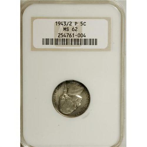 <B>1943/2-P 5C MS62 NGC.</B></I> NGC Census: (16/122). PCGS Population (3/239). Mintage: 271,164,992. Numismedia Wsl. Price for NGC/PCGS coin in MS62: $222. (#4019)<BR><BR><B>Coin Engraver:</B> Felix Schlag<BR><BR><b>Shipping:</b> Coins & Currency (<a target="_blank" href="http://www.heritageauctions.com/common/shipping.php">view shipping information</a>)