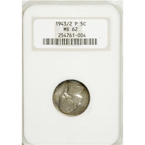 <B>1943/2-P 5C MS62 NGC.</B></I> NGC Census: (16/122). PCGS Population (3/239). Mintage: 271,164,992. Numismedia Wsl. Price for NGC/PCGS coin in MS62: $222. (#4019)<BR><BR><B>Coin Engraver:</B> Felix Schlag<BR><BR><b>Shipping:</b> Coins & Currency (<a target="_blank" href="http://www.heritageauctions.com/common/shipping.php">view shipping information</a>)