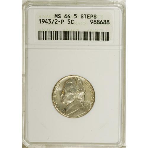 <B>1943/2-P 5C MS64 Five Steps ANACS.</B></I> The lower curve of the underdigit 2 is readily apparent under a glass. A pale gold and sky-blue near-Gem with vivacious luster and a sharp strike. A couple of spots are noted on the obverse. A scarce variety with five full steps.<BR><BR><b>Shipping:</b> Coins & Currency (<a target="_blank" href="http://www.heritageauctions.com/common/shipping.php">view shipping information</a>)