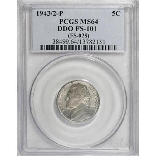 <B>1943/2-P 5C Double Die Obverse MS64 PCGS.</B></I> FS-101. PCGS Population (93/110). NGC Census: (46/71). Mintage: 271,164,992. Numismedia Wsl. Price for NGC/PCGS coin in MS64: $400. (#4019)<BR><BR><B>Coin Engraver:</B> Felix Schlag<BR><BR><b>Shipping:</b> Coins & Currency (<a target="_blank" href="http://www.heritageauctions.com/common/shipping.php">view shipping information</a>)