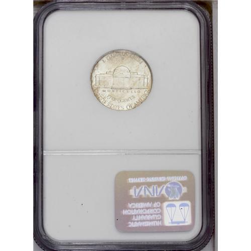 <B>1943/2-P<5C> MS66 NGC.</B></I> FS-028. The remnants of a previous 2 are clearly evident beneath the 3 in the date. A highly lustrous and well struck example that has an uneven partial coating of milky, multicolored patina on both sides. Wispy die striations are noted just above the right and left sides of Monticello. Other than a handful of tiny nicks near the centers of obverse and reverse, the surfaces are expertly preserved. Census: 25 in 66, 7 finer (1/06).