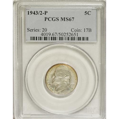 <B>1943/2-P 5C MS67 PCGS.</B></I> The base and diagonal of the previous 2 are clearly visible within the lower part of the digit 3 on this impressive Superb Gem. Both sides have brilliant silver luster that is framed by pale gold toning, especially visible along the obverse border. Only three non-Full Steps examples have been certified by PCGS at the MS67 grade level (4/07), with none finer. In addition, two other MS67 examples have received the Full Steps designation, also with none graded any finer.<BR><BR><b>Shipping:</b> Coins & Currency (<a target="_blank" href="http://www.heritageauctions.com/common/shipping.php">view shipping information</a>)