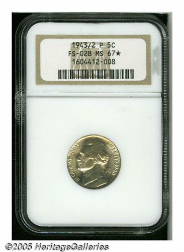 <B>1943/2-P<5C> MS67 <S NGC.</B></I> FS-028. Gently toned in gold and lilac hues. A lustrous Superb Gem with gorgeously preserved surfaces. A tiny planchet flaw, as made, on the steps. Population: 2 in 67 <S, 1 finer (4/05).