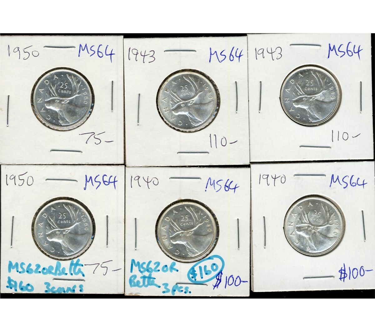 1943 25¢, 1943 & 1950, Lot of 6 coins MS62 and better, 2 of each date.