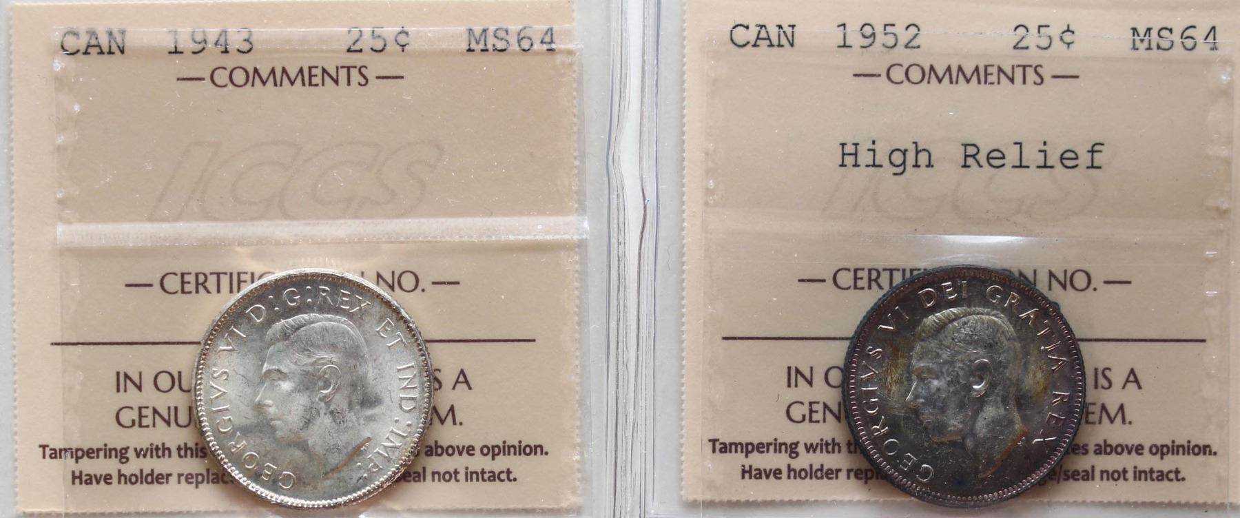 1943 25¢, 1952 "HR" Both coins ICCS Choice Mint State-64.