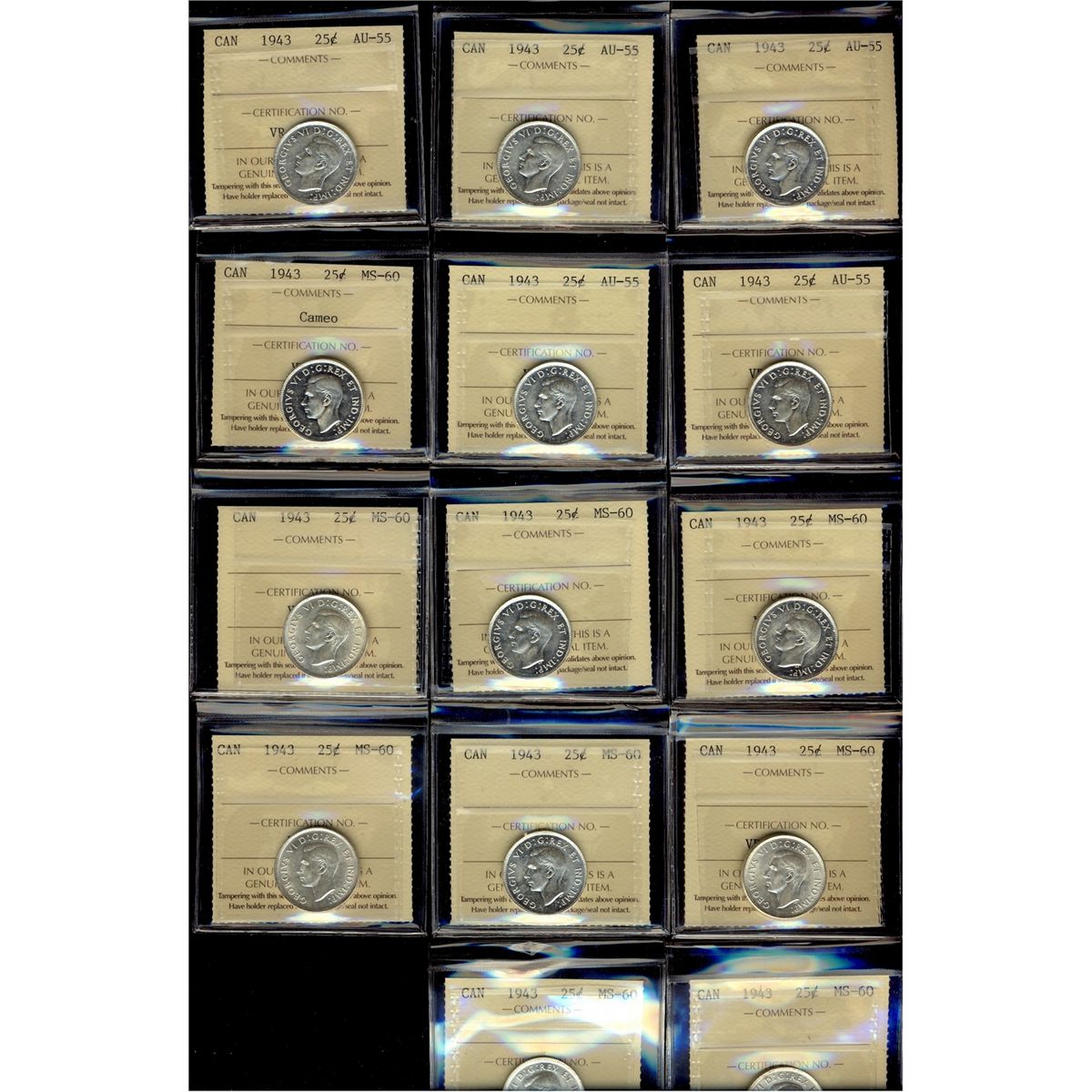 1943 25¢ AU55(5) & MS60(9). Lot of 14 ICCS graded coins.