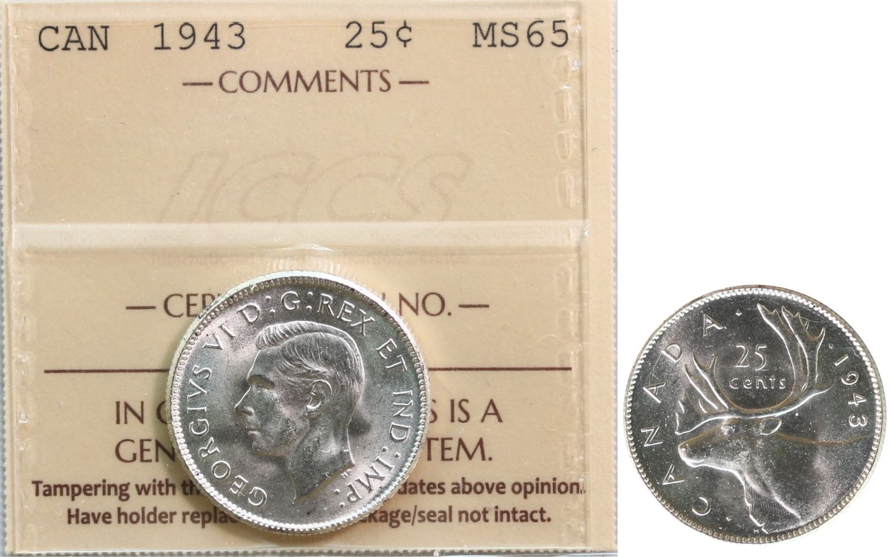 1943 25¢ ICCS Gem Mint State-65 Blast white example. Flashy!