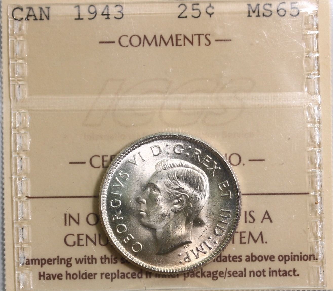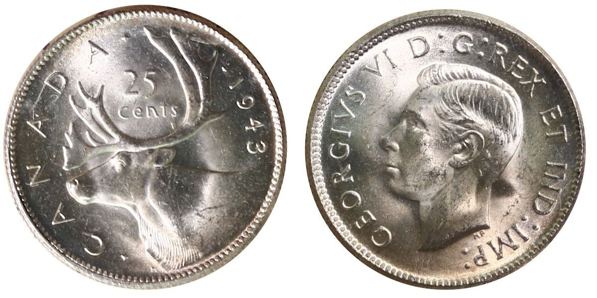1943 25¢ ICCS Gem Mint State-65. Lustrous.