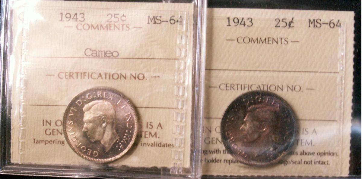 1943 25¢ ICCS MS64. Lot of 2 coins one designated Cameo.