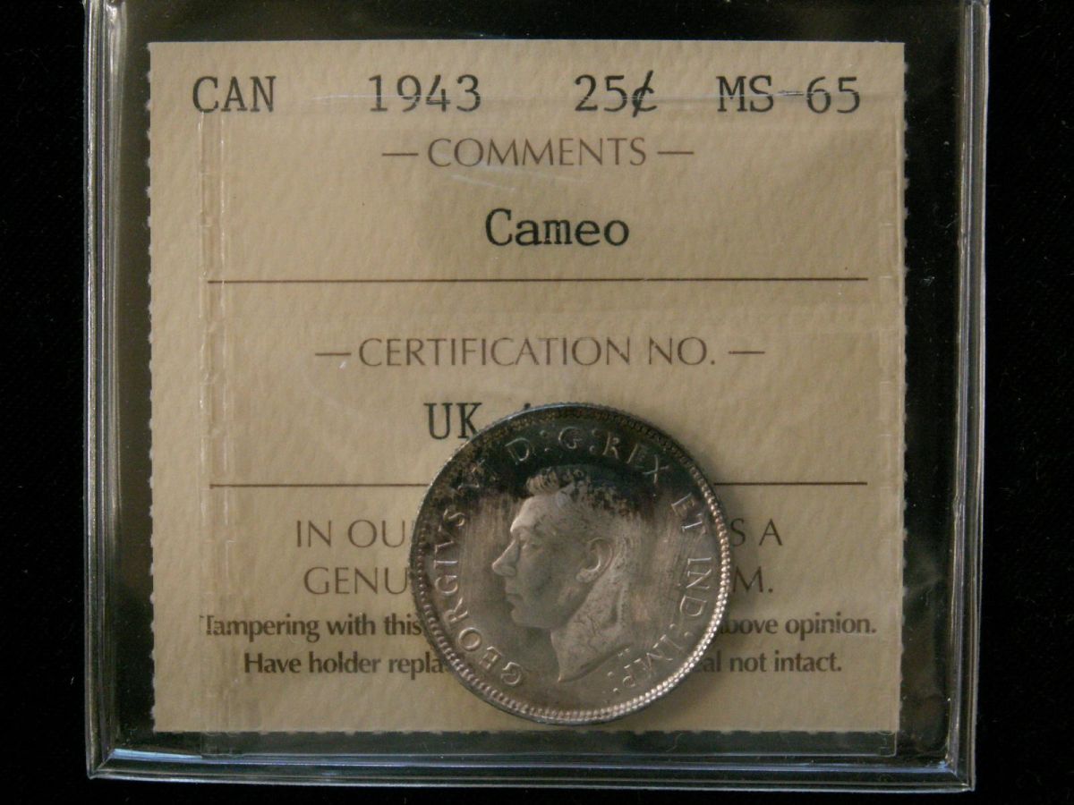 1943 25¢ ICCS MS65 Cameo. Intense tone on reverse.