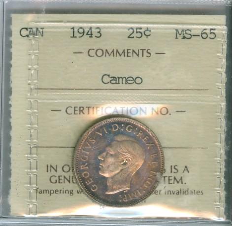1943 25¢ ICCS MS65. Golden to reddish tone.