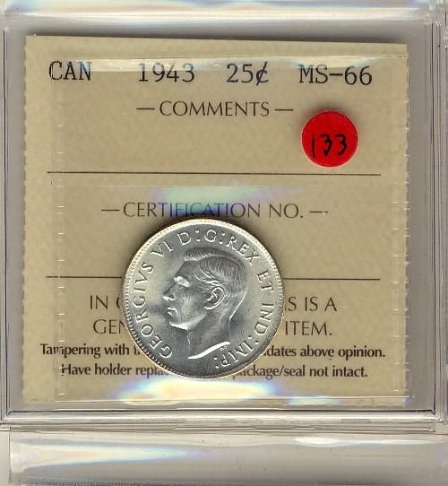 1943 25¢ ICCS MS66. Superb lustre and blast white in colour. Tied for Top 4 graded.