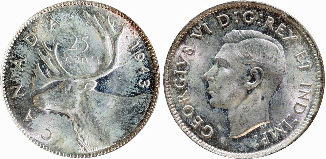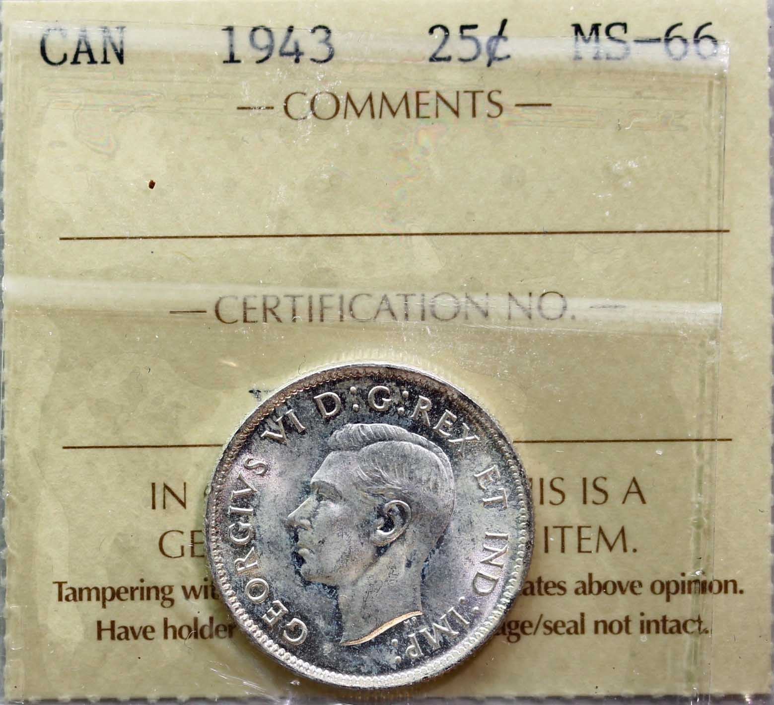 1943 25¢ ICCS Superb Gem Mint State-66 Fully lustrous with just a hint of golden tone over full underlying lustre. Very scarce this nice.