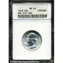 <B>1943<25C> Doubled Die Obverse MS64 ANACS.</B></I> Bright surfaces reveal a touch of gold toning on Washington's forehead and the obverse border, with speckled olive toning on the reverse. Minor doubling is noted on portions of the legend and the motto. <BR><BR><B>Important notice:</B> Heritage usually auctions material at the rate of 200-250 lots per hour. On some occasions eBay Live bid software or the Internet may not be able to keep up with the pace of the auction. We recommend placing a realistic absentee bid now as insurance to avoid disappointment. Occasionally the auctioneer may eliminate or reject an eBay Live bid, and the auctioneer may also reopen a lot after the close of the eBay live bidding (usually because we missed an audience bid), and may reject your bid even if it shows you as the winning bidder. By bidding via eBay Live, you agree that Heritage may award the lot to another bidder at its sole discretion under the circumstances described above or any other reasonable circumstances. Since eBay bids are not shown to us until we open the lot on the floor, we treat those bids just like floor bids. In most cases the floor responds before the eBay bid is presented to us, due to Internet lag time, so for consistency we have made it a policy that floor bids are always considered first over tie eBay live bids. Also please note that all Heritage lots purchased through eBay Live carry a 20% Buyer's Premium. Please make sure you read the Terms and Conditions before you bid.