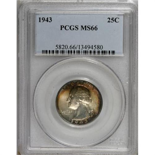 <B>1943 25C MS66 PCGS.</B></I> PCGS Population (521/62). NGC Census: (698/246). Mintage: 99,700,000. Numismedia Wsl. Price for NGC/PCGS coin in MS66: $55. (#5820)<BR><BR><B>Coin Engraver:</B> John Flanagan<BR><BR><b>Shipping:</b> Coins & Currency (<a target="_blank" href="http://www.heritageauctions.com/common/shipping.php">view shipping information</a>)