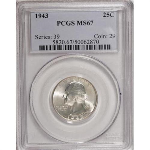 <B>1943 25C MS67 PCGS.</B></I> PCGS Population (64/2). NGC Census: (244/2). Mintage: 99,700,000. Numismedia Wsl. Price for NGC/PCGS coin in MS67: $325. (#5820)<BR><BR><B>Coin Engraver:</B> John Flanagan<BR><BR><b>Shipping:</b> Coins & Currency (<a target="_blank" href="http://www.heritageauctions.com/common/shipping.php">view shipping information</a>)