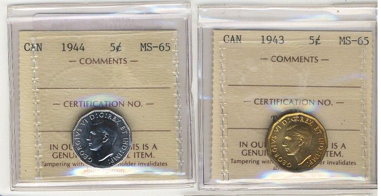 1943 5¢ & 1944 ICCS MS65. Lot of 2 coins.