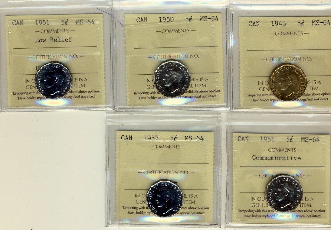 1943 5¢, 1950, 1951 LR, 1951 Comm & 1952 ICCS MS64. Lot of 5 coins.