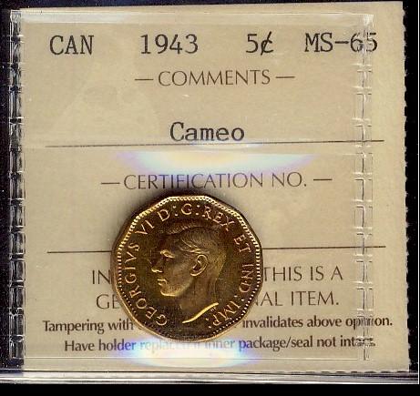 1943 5¢ ICCS MS65 Cameo.