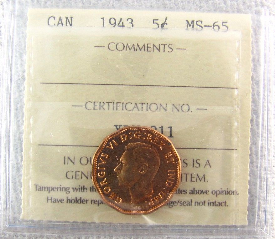 1943 5¢ Tombac ICCS MS65. Fully brilliant.