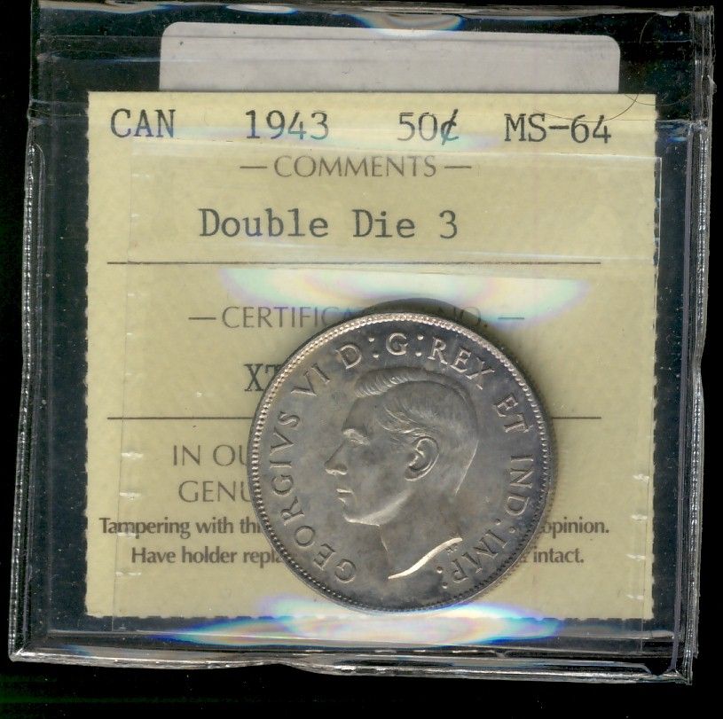 1943 50¢ Dbl Die 3 ICCS MS64.