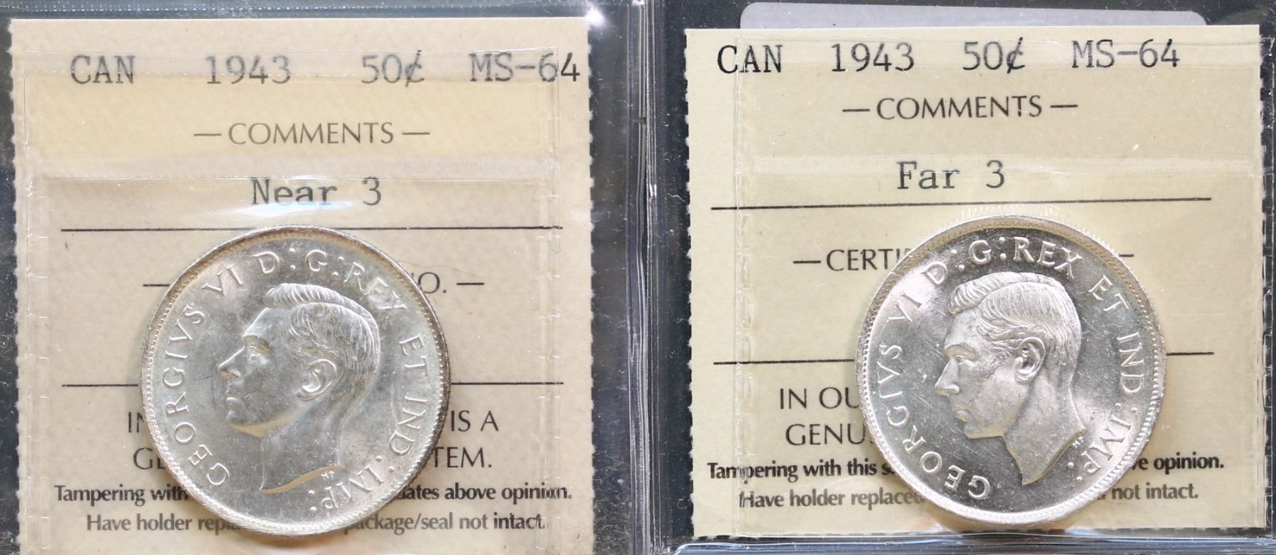 1943 50¢ Near3, Far 3, both ICCS Choice Mint State-64.