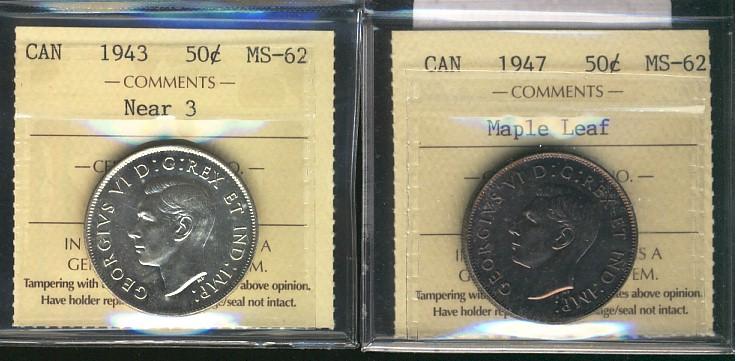 1943 50¢ Nr & 1947 ML ICCS MS62. Lot of 2 coins.