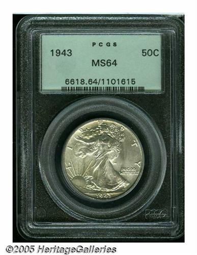 <B>1943<50C> MS64 PCGS.</B></I> Lustrous and well struck, this near-Gem has a pleasing, nicely preserved overall appearance, especially on the reverse, which seems entirely unmarked. The obverse reveals a faint luster graze and a small milling mark, both in the right field area, which seem to prevent the Gem assessment.