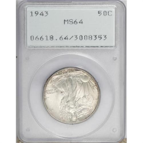 <B>1943 50C MS64 PCGS.</B></I> PCGS Population (5246/8729). NGC Census: (3016/6729). Mintage: 53,190,000. Numismedia Wsl. Price for NGC/PCGS coin in MS64: $48. (#6618)<BR><BR><B>Coin Engraver:</B> Adolph A. Weinman<BR><BR><b>Shipping:</b> Coins & Currency (<a target="_blank" href="http://www.heritageauctions.com/common/shipping.php">view shipping information</a>)