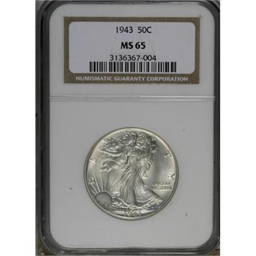 <B>1943 50C MS65 NGC.</B></I> NGC Census: (3929/2816). PCGS Population (6148/2645). Mintage: 53,190,000. Numismedia Wsl. Price for NGC/PCGS coin in MS65: $125. (#6618)<BR><BR><B>Coin Engraver:</B> Adolph A. Weinman<BR><BR><b>Shipping:</b> Coins & Currency (<a target="_blank" href="http://www.heritageauctions.com/common/shipping.php">view shipping information</a>)