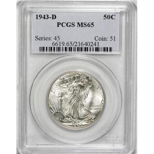 <B>1943 50C MS65 PCGS.</B></I> PCGS Population (6035/2594). NGC Census: (3858/2720). Mintage: 53,190,000. Numismedia Wsl. Price for NGC/PCGS coin in MS65: $130. (#6618)<BR><BR><B>Coin Engraver:</B> Adolph A. Weinman<BR><BR><b>Shipping:</b> Coins & Currency (<a target="_blank" href="http://www.heritageauctions.com/common/shipping.php">view shipping information</a>)